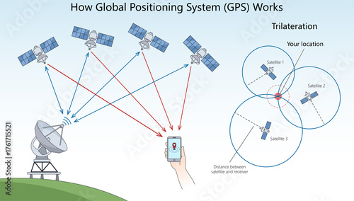 Global Positioning System (GPS) determines location using satellites and trilateration with signal distances diagram hand drawn schematic raster. Science educational illustration