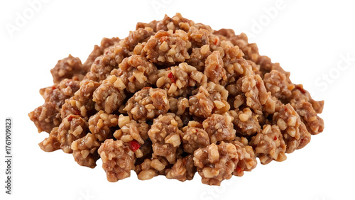 Chopped cooked beef mince with red pepper and seasoning on the transparent background for culinary and recipe use