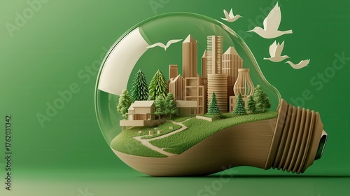 A conceptual image depicting a sustainable eco friendly city landscape enclosed within the shape of a lightbulb symbolizing innovation and the future of urban development