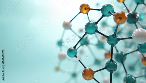 3D render shows abstract molecular structure. Bright colored spheres represent atoms connected via black chemical bonds. Science illustration represents bio tech, chemistry research, data. Intricate