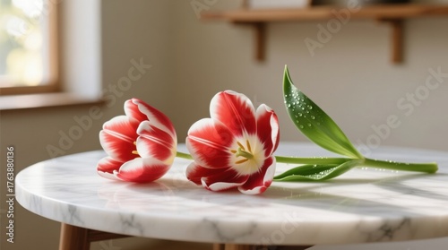 two red and white tulips sitting on top of a marble table The table is situated in front of a wall with a window on the left side and a wooden object on the right