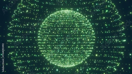 緑色の光のパーティクルが球体になって集まるCGエフェクト背景。データの集積をイメージしたイラスト