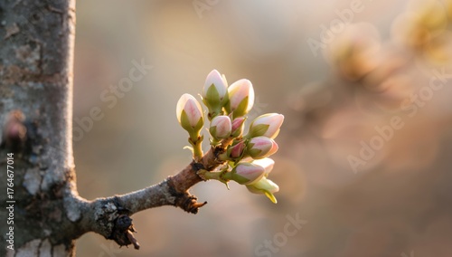 Close-up of apple tree buds beginning to burst