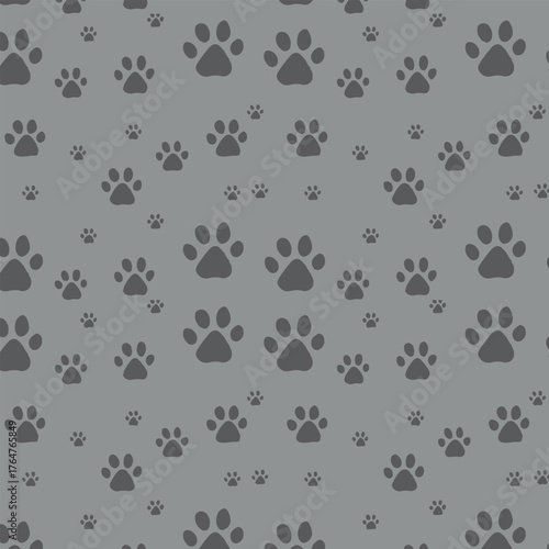 Seamless Grey Paw Print Pattern Background, Monochromatic Pet Theme Vector for Fabric and Digital Paper