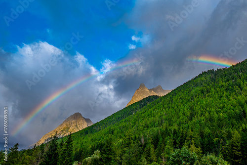 Tęcza nad górami w Alpach, zdjęcie zrobione w Vallorcine, Francja