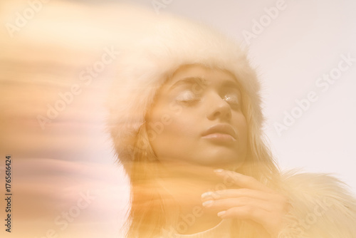 Young blonde woman in cozy winter attire with soft makeup in a serene indoor setting