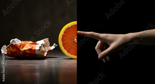 A compelling visual dichotomy presents a crumpled wrapper and fresh grapefruit juxtaposed with a hand pointing into darkness, symbolizing crucial life choices.