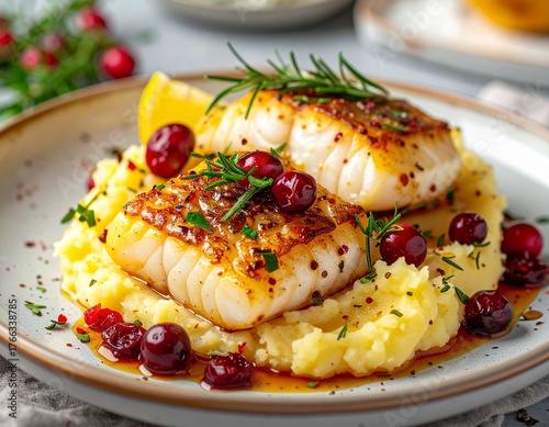 Duszony dorsz z żurawiną i puree ziemniaczanym
