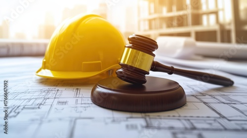 A hard hat and gavel are placed on a blueprint, symbolizing the intersection of construction and law in building projects.