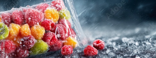 Vividly Colored Frozen Fruits in Clear Bag with Frost Overlay Against Dark Background