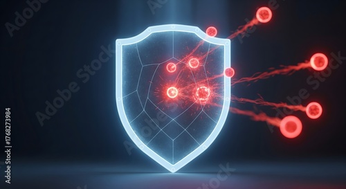 Futuristic glowing shield defending against abstract red threats, symbolizing digital security, cybersecurity, and system defense