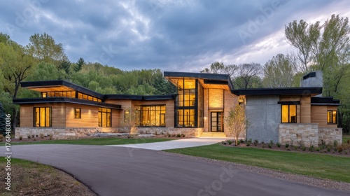 Modern, contemporary home situated on a wooded lot.