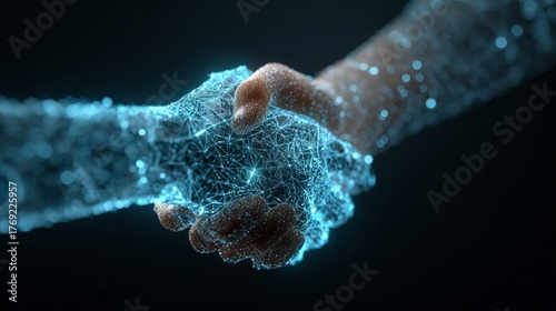 Digital handshake forming future partnerships in technology and innovation, signifying trust and cooperation with interconnected networks for success