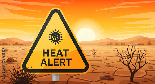 Heat Alert Sign in Cracked Desert Landscape, Vector Illustration