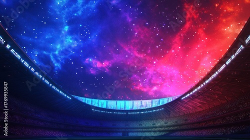 Futuristic stadium interior with colorful cosmic ceiling