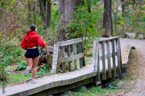 Jeune femme faisant du jogging sur un chemin en bois dans le parc en automne