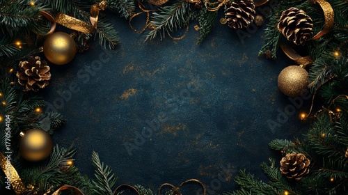 Festive arrangement of Christmas ornaments, pine cones, and evergreen branches on a dark textured background, creating a warm holiday atmosphere with copy space for seasonal greetings