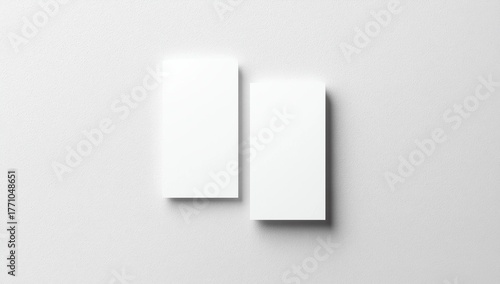 Closeup mockup of two blank vertical business cards at light natural wooden background