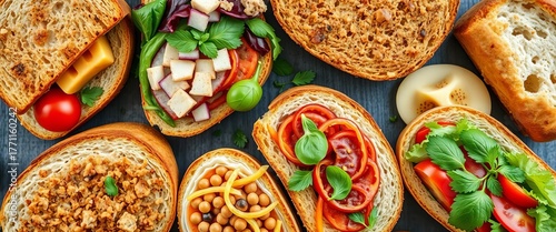 Assorted gourmet sandwiches, artisan breads, fillings visible, flat lay, tasty, photo