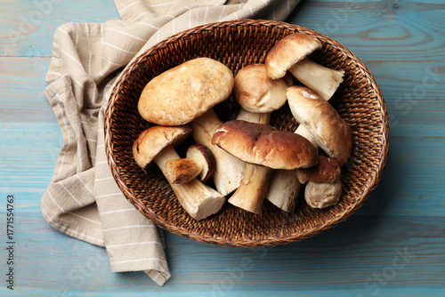 Fresh porcini mushrooms in wicker basket on light blue wooden table, top view