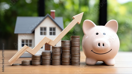 A close-up of a piggy bank beside stacks of coins, symbolizing savings and investment, with a wooden house model and a growth chart in the background. Perfect for financial themes.