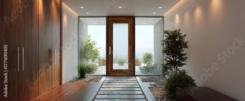 The entryway’s modern glass door with metal handles shines like a sleek jewel.