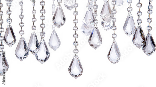 Close up of hanging crystal chandelier pendants on strings against a black background studio shot