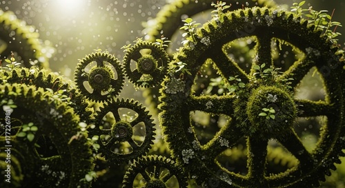 An intricate clockwork mechanism of interlocking gears overgrown with vibrant green moss and plants.