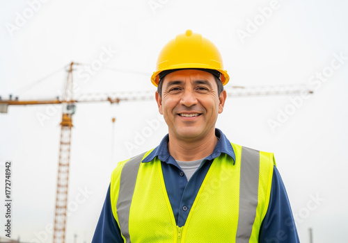 Portrait cheerful latino male construction worker wearing safety vest hard hat standing in front of crane studio outdoor background
