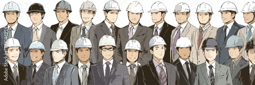 Profissionais da engenharia e construção, usando capacetes de segurança e ternos, representam a colaboração e o sucesso em projetos industriais.