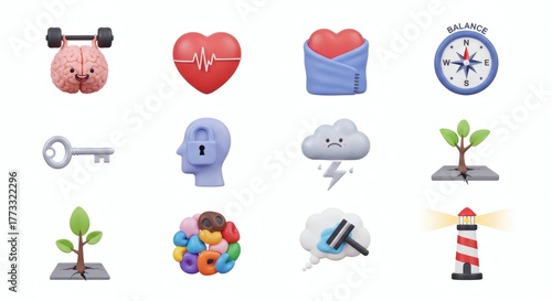3D Icon Collection Mental Well-being, Personal Growth, Emotional Resilience, Cognitive Health, Self-Care, and Inner Balance.