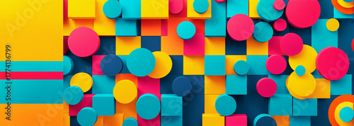 abstract 3d geometric pattern with layered cubes and circles in bright colors.