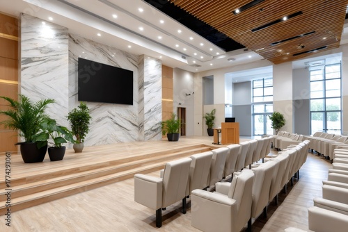 Empty modern conference lecture hall preparing for presentation