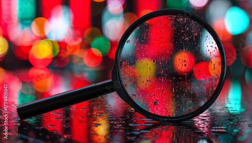 The composition features a bright red glowing magnifying glass situated on a black surface with a futuristic tech-inspired theme