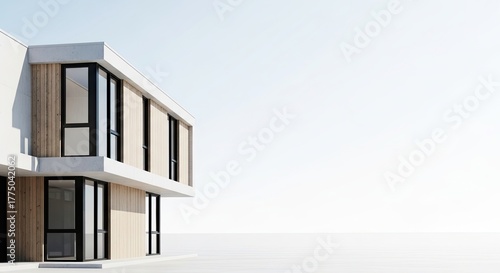 A modern, minimalist house with a white exterior and wooden siding, situated on a vast, open expanse of water.