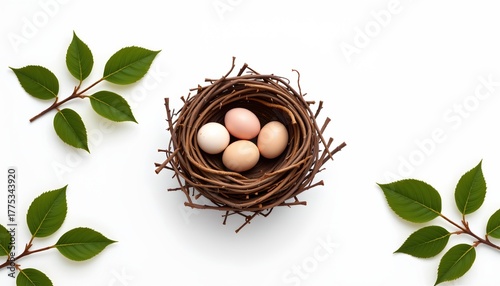 A charming bird's nest with three brown eggs and two white ones inside. It is situated against a backdrop of leaves that frame the nest