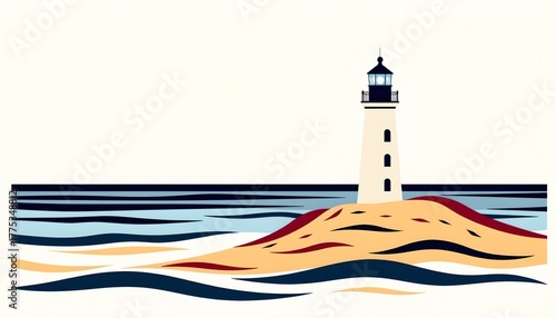 An illustration of a lighthouse situated atop a coastal cliff with wavy ocean waters below. The lighthouse is characterized by its white tower structure with a small blue flag on top.