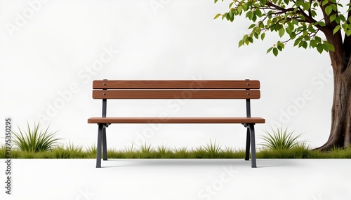 A serene outdoor setting featuring a wooden bench with a metal frame, situated in a landscape with grass and small shrubs