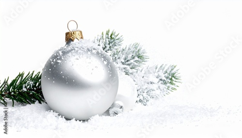 A silver Christmas ornament with snowy pine leaves creating a festive and wintery atmosphere. The ornament sits amidst a pile of fresh snow, adding a touch of winter wonder.