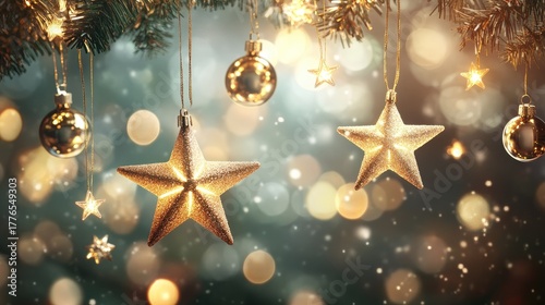 Decorative Christmas scene with star lights hanging across a blurred festive background with sparkles and ornaments