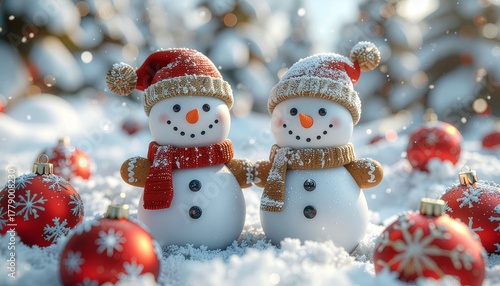 Bałwanki stojące na śniegu otoczone bombkami i gałązkami świerku. Bożonarodzeniowe, zimowe tło