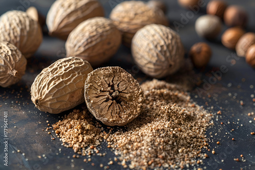Całe i mielone gałki muszkatołowe na ciemnym tle – aromatyczna przyprawa w kuchni i ziołolecznictwie