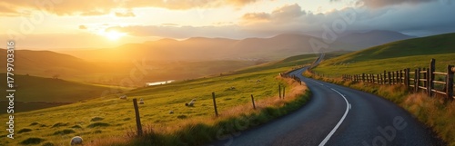 Golden sun sets over winding rural road in Scottish hills. Green pastures with grazing sheep stretch across rolling landscape. Distant mountains, serene lake appear under evening sky. Scenic travel