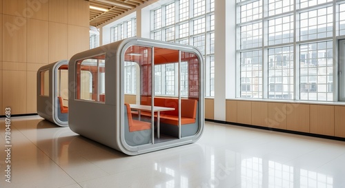 Modern modular office pods with orange seating and white tables are situated in a bright open space with large windows and wooden paneling modular furniture modern interior contemporary design