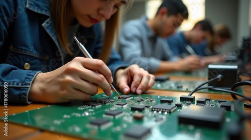 Chica soldando con esmero diminutos resistores en una placa de circuito impreso; precisión técnica, iluminación ambiental cálida, ambiente de formación profesional sincero