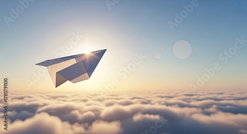 Symbolic paper airplane soaring gracefully above soft clouds during a breathtaking sunrise symbolizing new beginnings, dreams, and boundless possibilities for adventure and innovation.