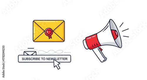 Vivid cartoon illustration featuring a yellow envelope with a red heart-shaped seal, a red and white megaphone with sound waves, and a "Subscribe to Newsletter" banner with a cursor, all set against