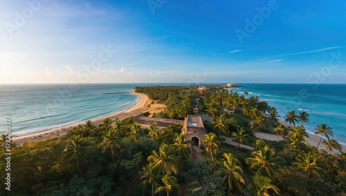 An ancient fortification situated within a coastal resort area, showcasing erosion risk, tropical vacation