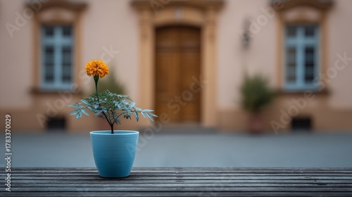 Vibrant marigold blooms are flourishing in a blue container situated on a porch