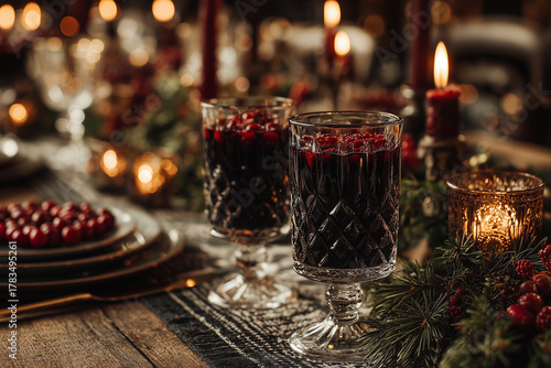 Dwa kryształowe kielichy na nóżce wypełnione grzanym winem lub ponczem żurawinowym, ustawione na świątecznie udekorowanym stole z igliwiem i zapalonymi świecami.